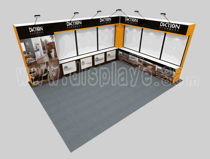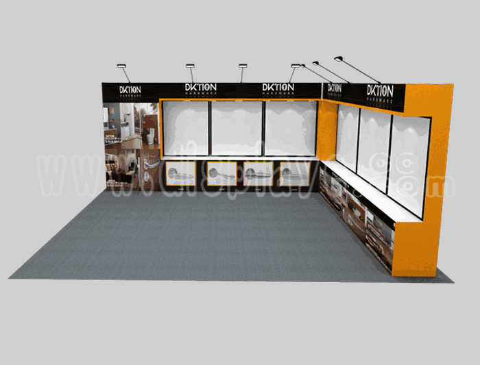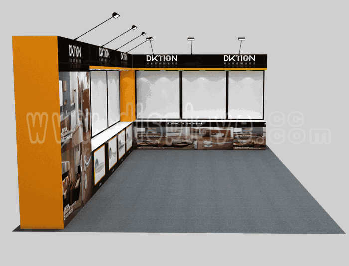 温馨提示:如你想参照这设计图DIY设计构思你想要的展台,此造型结构适用3x4m以下方形展位,你可增加你想要的展示功能或更多的引人注目特装造型。