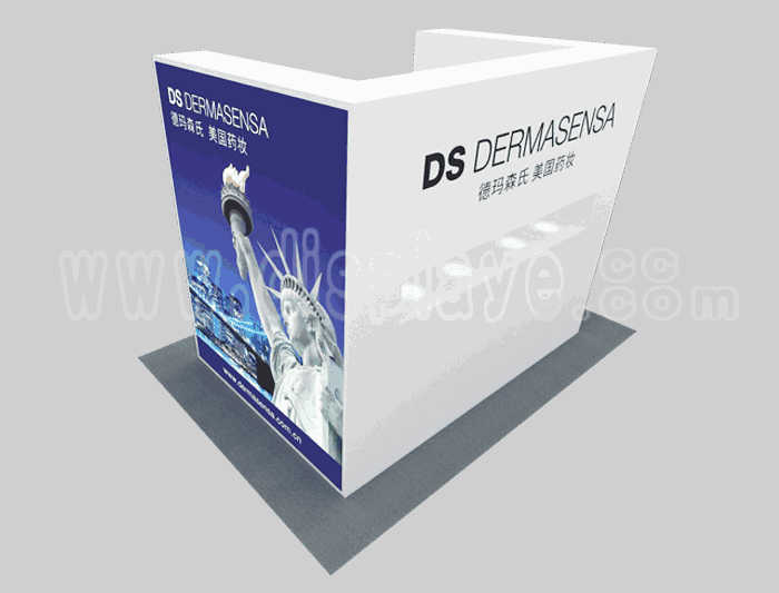 温馨提示:如你想参照这设计图DIY设计构思你想要的展台,此造型结构适用3x3m以下方形展位,你可增加你想要的展示功能或更多的引人注目特装造型。