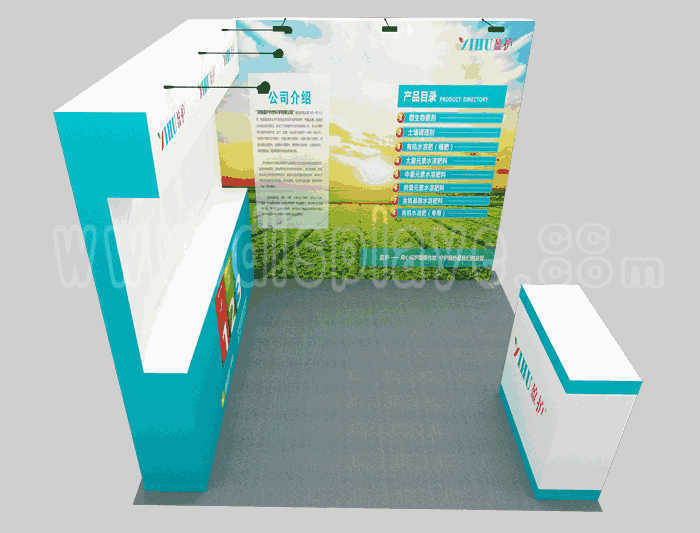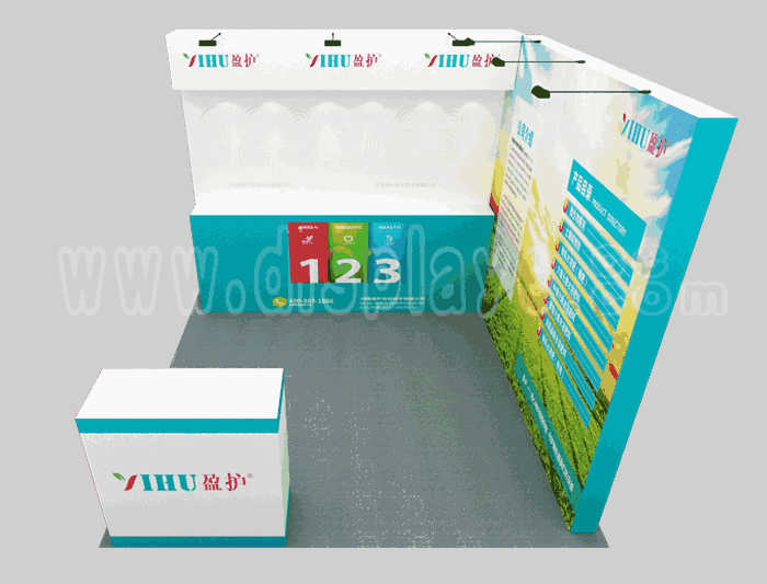 温馨提示:如你想参照这设计图DIY设计构思你想要的展台,此造型结构适用3x3m以下方形展位,你可增加你想要的展示功能或更多的引人注目特装造型。