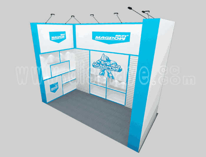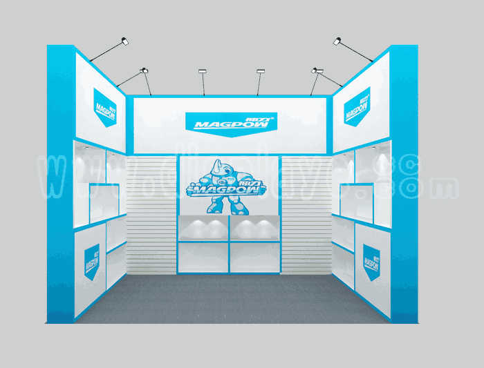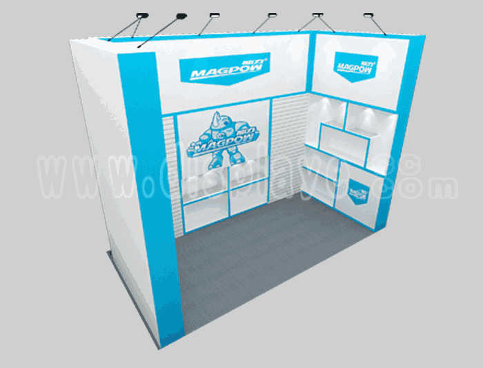 温馨提示:如你想参照这设计图DIY设计构思你想要的展台,此造型结构适用3x3m以下方形展位,你可增加你想要的展示功能或更多的引人注目特装造型。