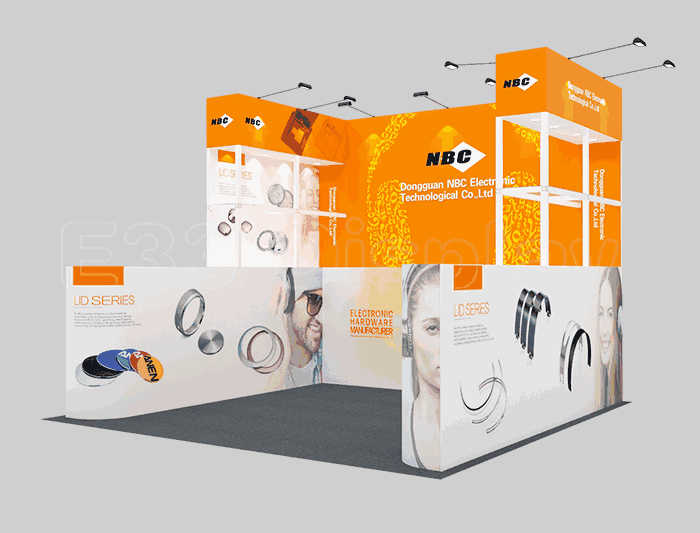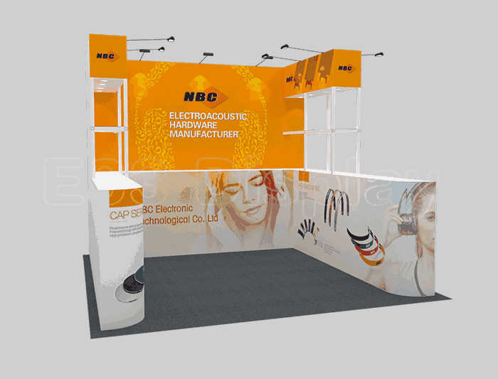 温馨提示:如你想参照这设计图DIY设计构思你想要的展台,此造型结构适用3x3m以下方形展位,你可增加你想要的展示功能或更多的引人注目特装造型。