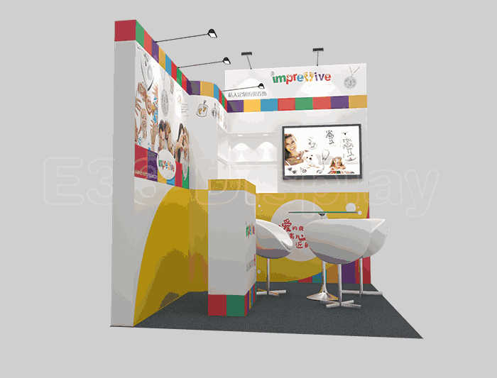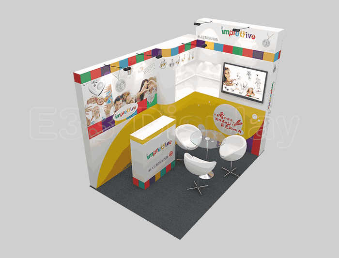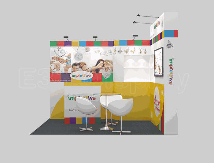 温馨提示:如你想参照这设计图DIY设计构思你想要的展台,此造型结构适用3x2m以下方形展位,你可增加你想要的展示功能或更多的引人注目特装造型。
