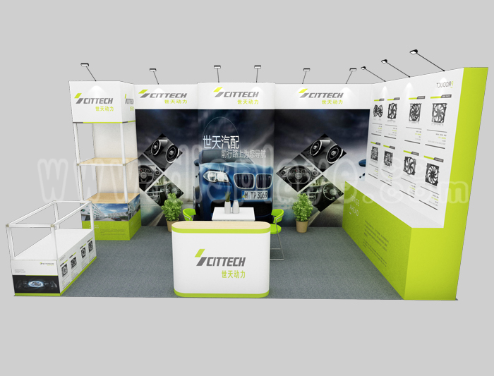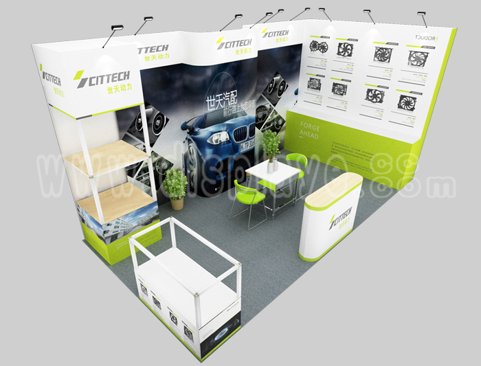 如你想参照这设计图DIY设计构思你想要的展台,此造型结构适用3x6m以下方形展位,你可增加你想要的展示功能或更多的引人注目特装造型。