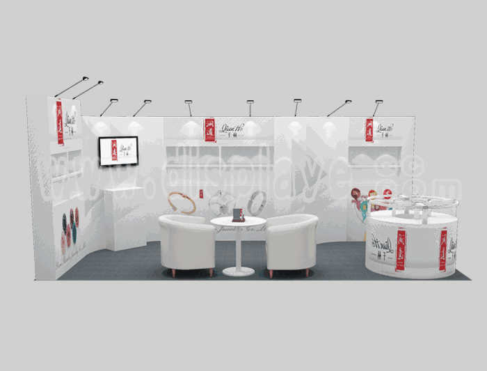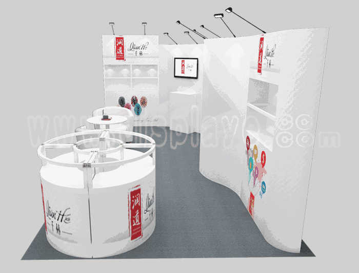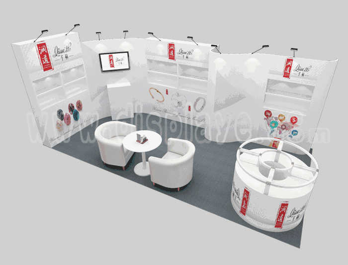 如你想参照这设计图DIY设计构思你想要的展台,此造型结构适用3x6m以下方形展位,你可增加你想要的展示功能或更多的引人注目特装造型。