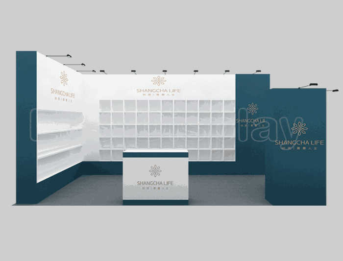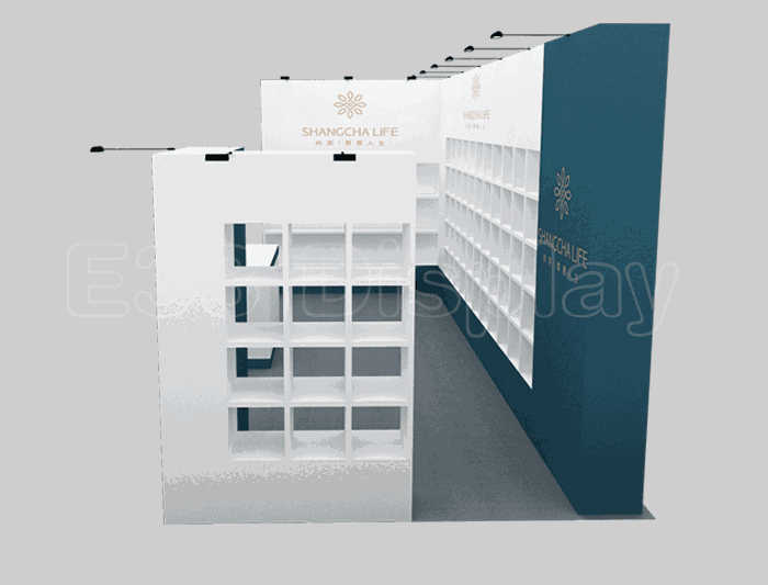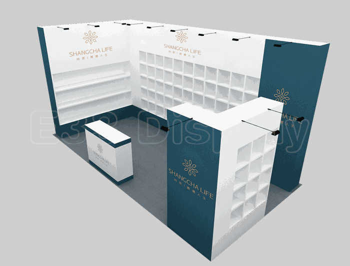 如你想参照这设计图DIY设计构思你想要的展台,此造型结构适用3x6m以下方形展位,你可增加你想要的展示功能或更多的引人注目特装造型。