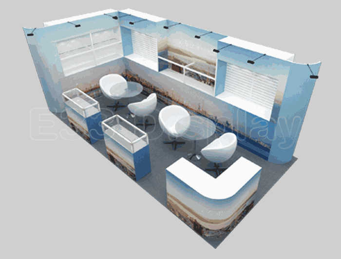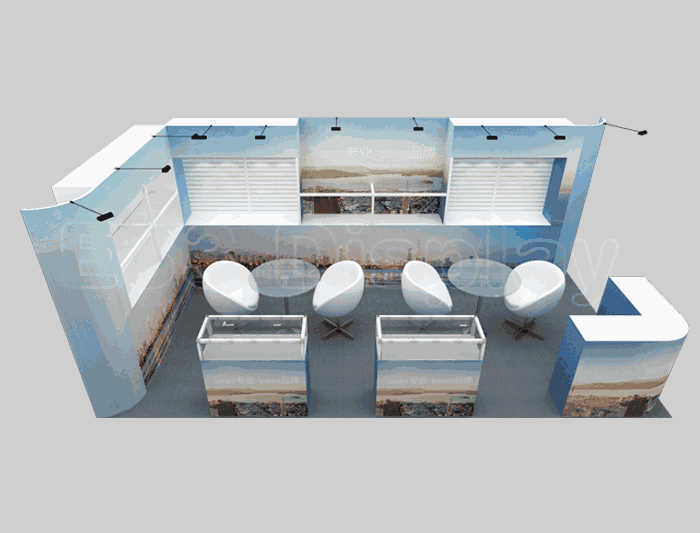 如你想参照这设计图DIY设计构思你想要的展台,此造型结构适用3x6m以下方形展位,你可增加你想要的展示功能或更多的引人注目特装造型。