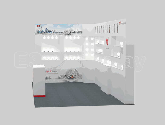 如你想参照这设计图DIY设计构思你想要的展台,此造型结构适用3x6m以下方形展位,你可增加你想要的展示功能或更多的引人注目特装造型。