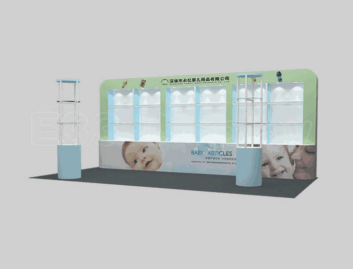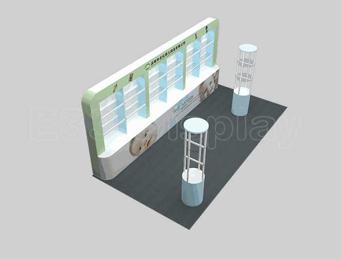 如你想参照这设计图DIY设计构思你想要的展台,此造型结构适用3x6m以下方形展位,你可增加你想要的展示功能或更多的引人注目特装造型。