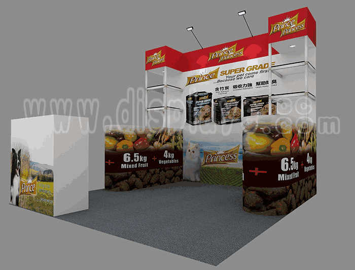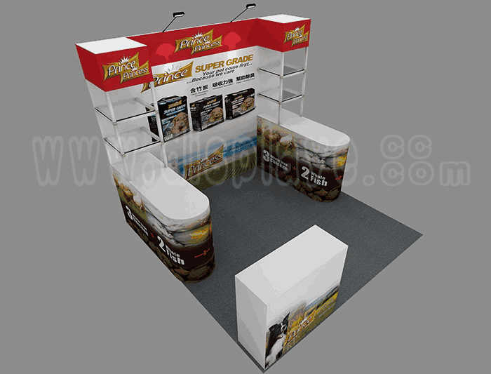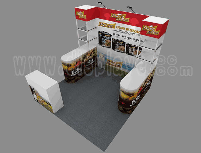Tips: If you want to DIY design your own stand, this modeling structure applies to 3x3m square booth or below, you can increase more exhibition function or more striking customized modeling.