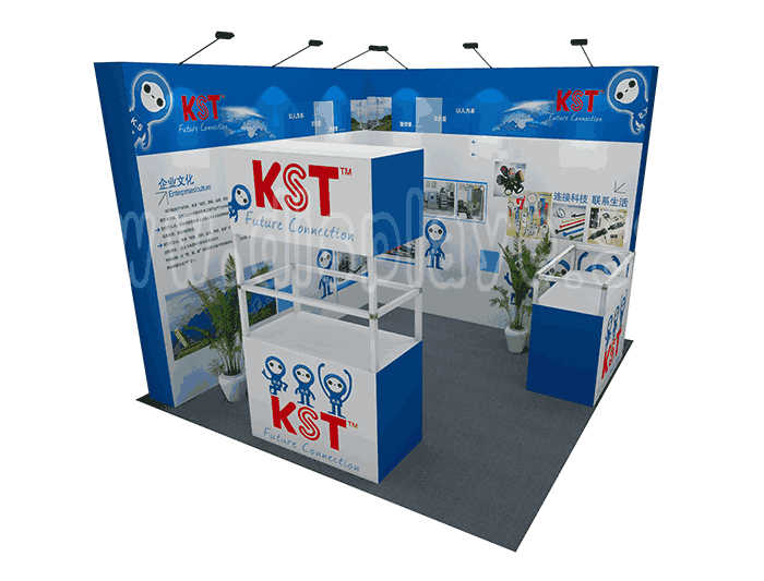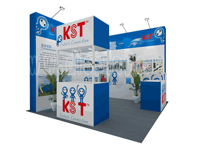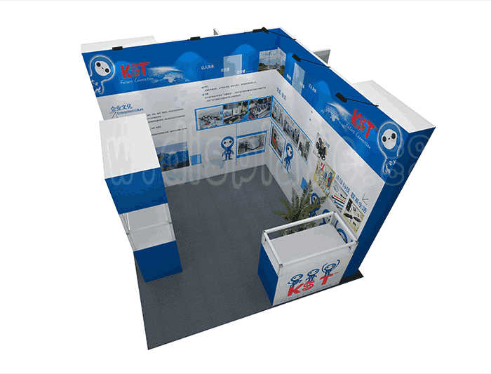 Tips: If you want to DIY design your own stand, this modeling structure applies to 3x3m square booth or below, you can increase more exhibition function or more striking customized modeling.