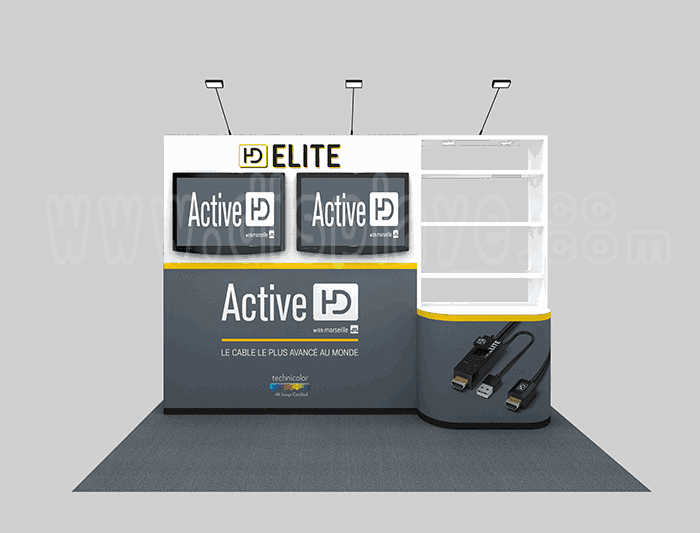 Tips: If you want to DIY design your own stand, this modeling structure applies to 3x3m square booth or below, you can increase more exhibition function or more striking customized modeling.