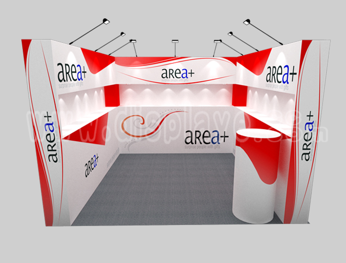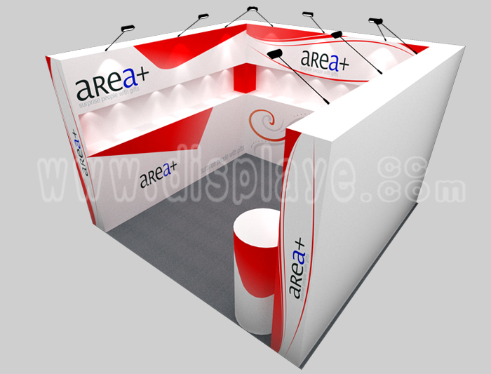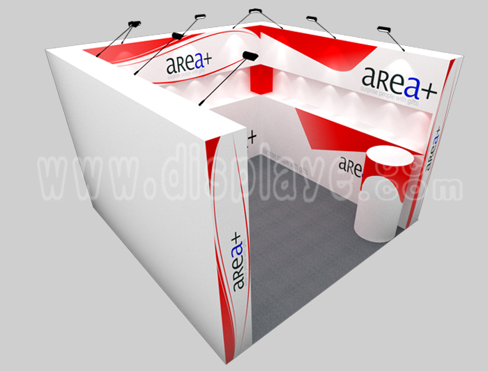 Tips: If you want to DIY design your own stand, this modeling structure applies to 3x3m square booth or below, you can increase more exhibition function or more striking customized modeling.