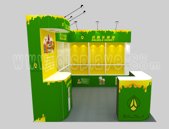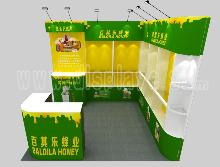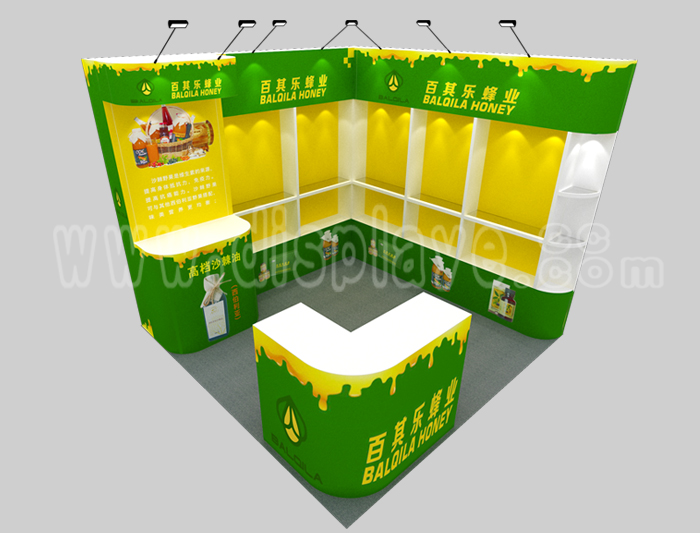 Tips: If you want to DIY design your own stand, this modeling structure applies to 3x3m square booth or below, you can increase more exhibition function or more striking customized modeling.