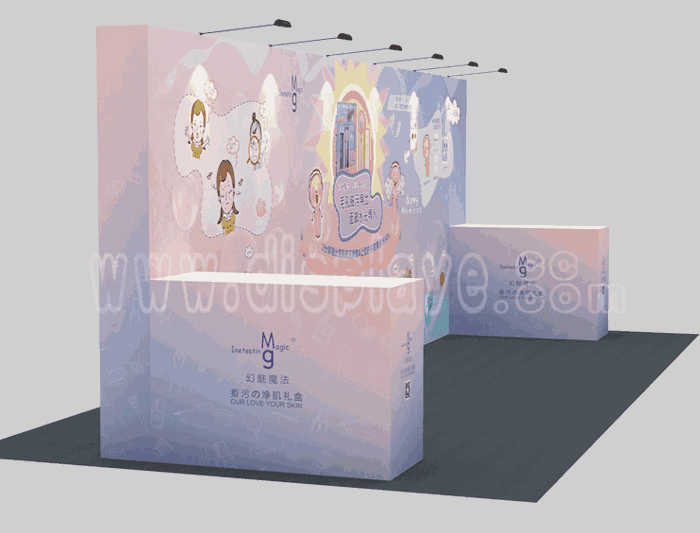 Tips: If you want to DIY design your own stand, this modeling structure applies to 3x6m square booth or below, you can increase more exhibition function or more striking customized modeling.