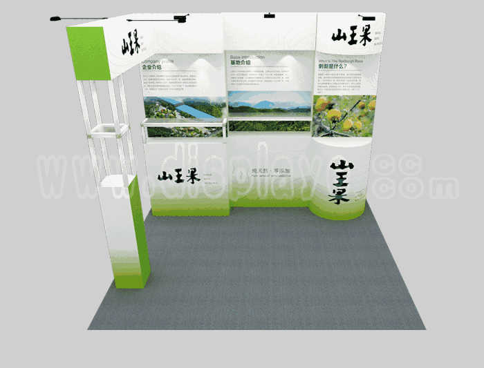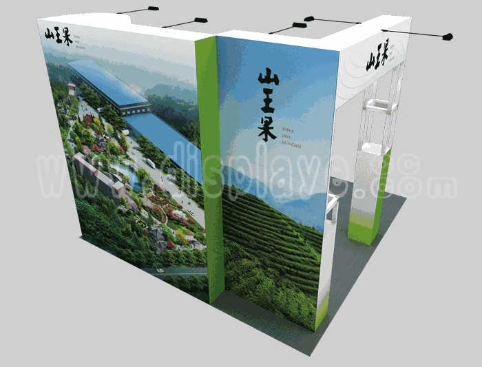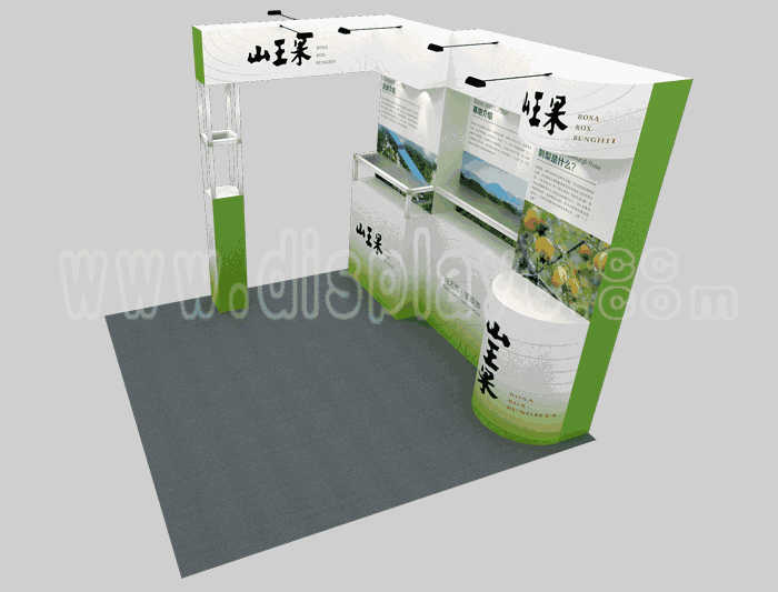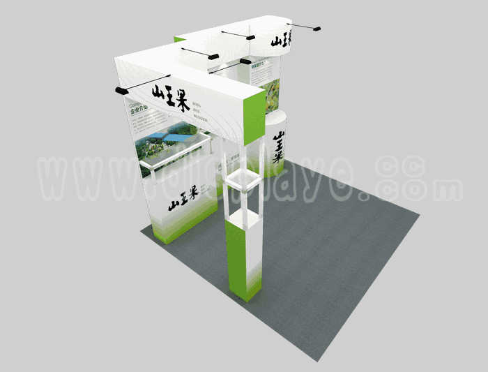 Tips: If you want to DIY design your own stand, this modeling structure applies to 3x3m square booth or below, you can increase more exhibition function or more striking customized modeling.