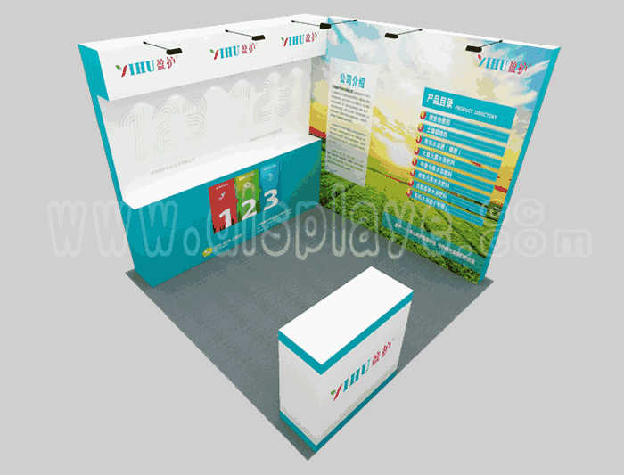 Tips: If you want to DIY design your own stand, this modeling structure applies to 3x3m square booth or below, you can increase more exhibition function or more striking customized modeling.