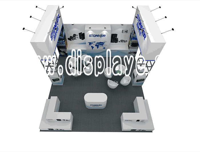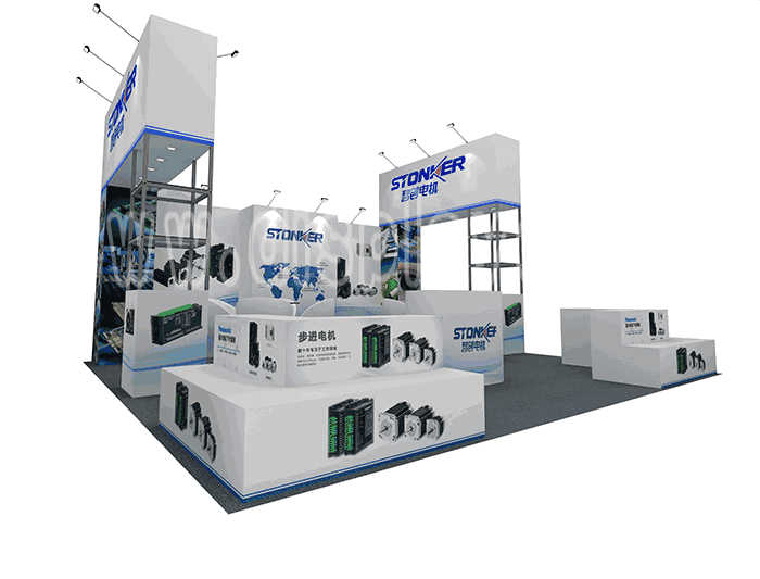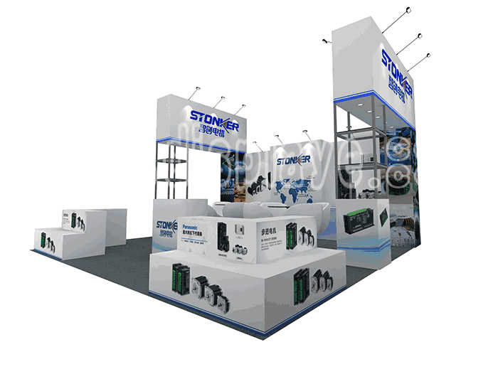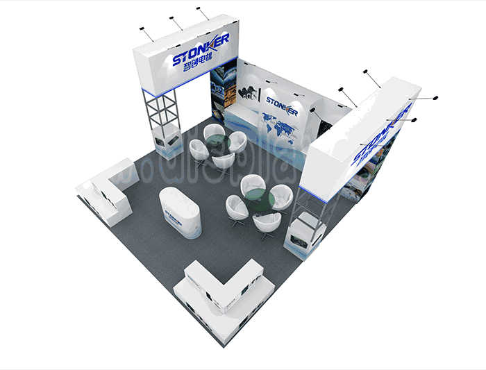 Tips: If you want to DIY design your own stand, this modeling structure applies to 6x6m square booth or below, you can increase more exhibition function or more striking customized modeling.