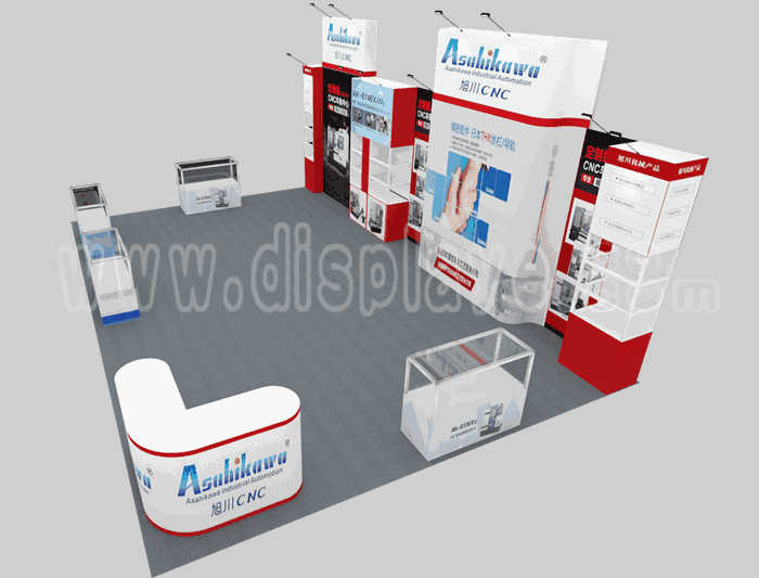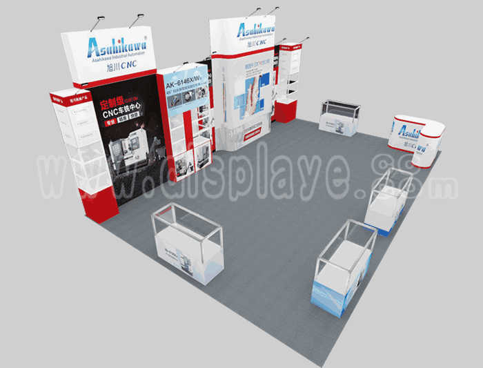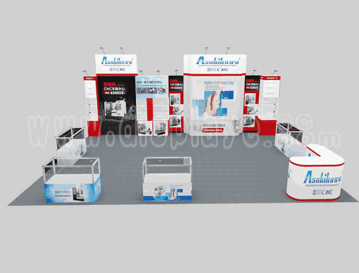 Tips: If you want to DIY design your own stand, this modeling structure applies to 6x9m square booth or below, you can increase more exhibition function or more striking customized modeling.