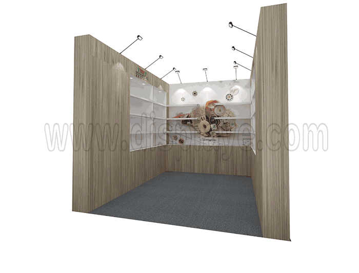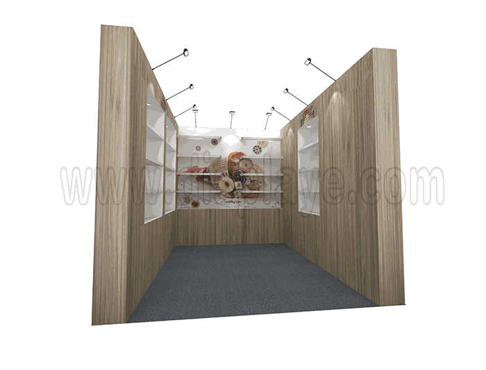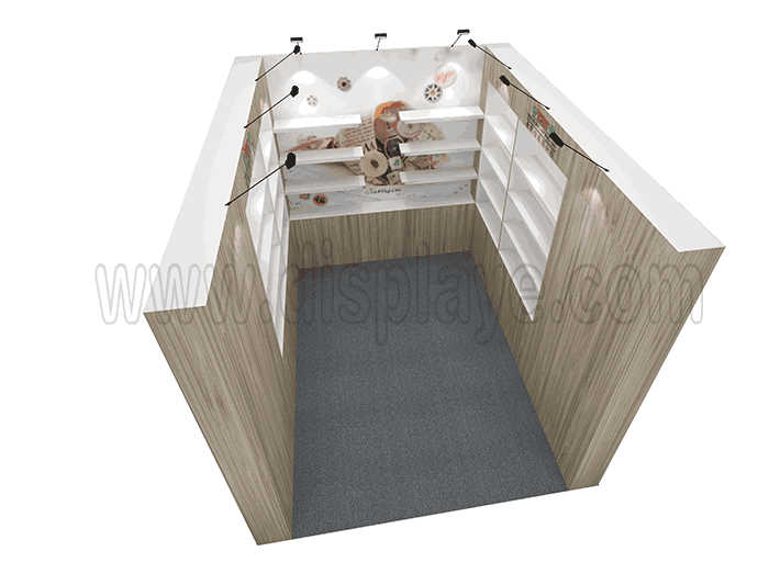 Tips: If you want to DIY design your own stand, this modeling structure applies to 3x3m square booth or below, you can increase more exhibition function or more striking customized modeling.