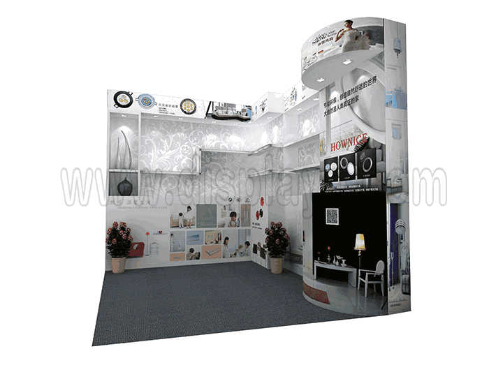 Tips: If you want to DIY design your own stand, this modeling structure applies to 3x3m square booth or below, you can increase more exhibition function or more striking customized modeling.