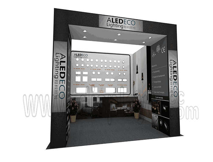 Tips: If you want to DIY design your own stand, this modeling structure applies to 3x3m square booth or below, you can increase more exhibition function or more striking customized modeling.