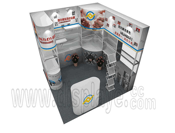 Tips: If you want to DIY design your own stand, this modeling structure applies to 3x3m square booth or below, you can increase more exhibition function or more striking customized modeling.